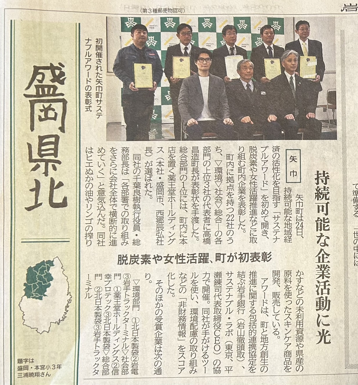 生産性向上と働きやすい職場環境づくりに取り組む企業を表彰するワーク・ライフ・バランス主催の「働き方改革企業2019」の優秀賞に選ばれました。その取組の詳細が盛岡タイムスに掲載されました。