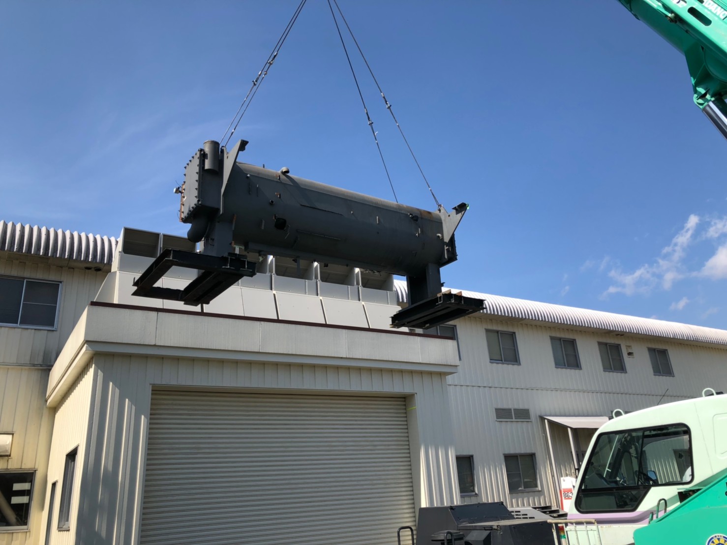 【写真3】 新規モジュールチラーの搬入作業。月3台の製造納期で工期を3回に分け工場内の冷房運用に最低限支障の無いよう行程を進めました。