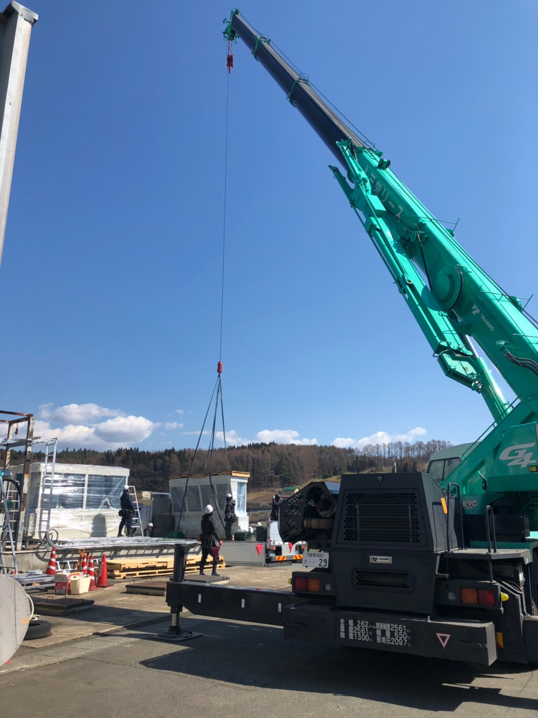 【写真2】 玉掛作業と溶断により分割しながらの吊込み作業。10t大型車3台分相当の搬出でした