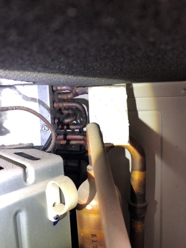 【写真5】室外機熱交換器Uベンド部に油シミが発生しております。(システム漏洩点検)