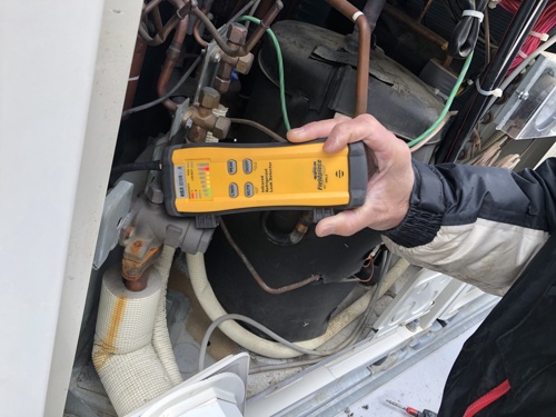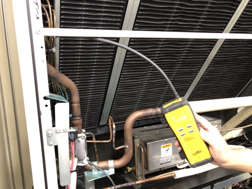 【写真2・3】リークテスターを溶接部等の漏れが発生しやすい箇所にあてて点検します。(直接法)フロンガスに反応すると、バーグラフが赤くなり警告音が鳴ります。
