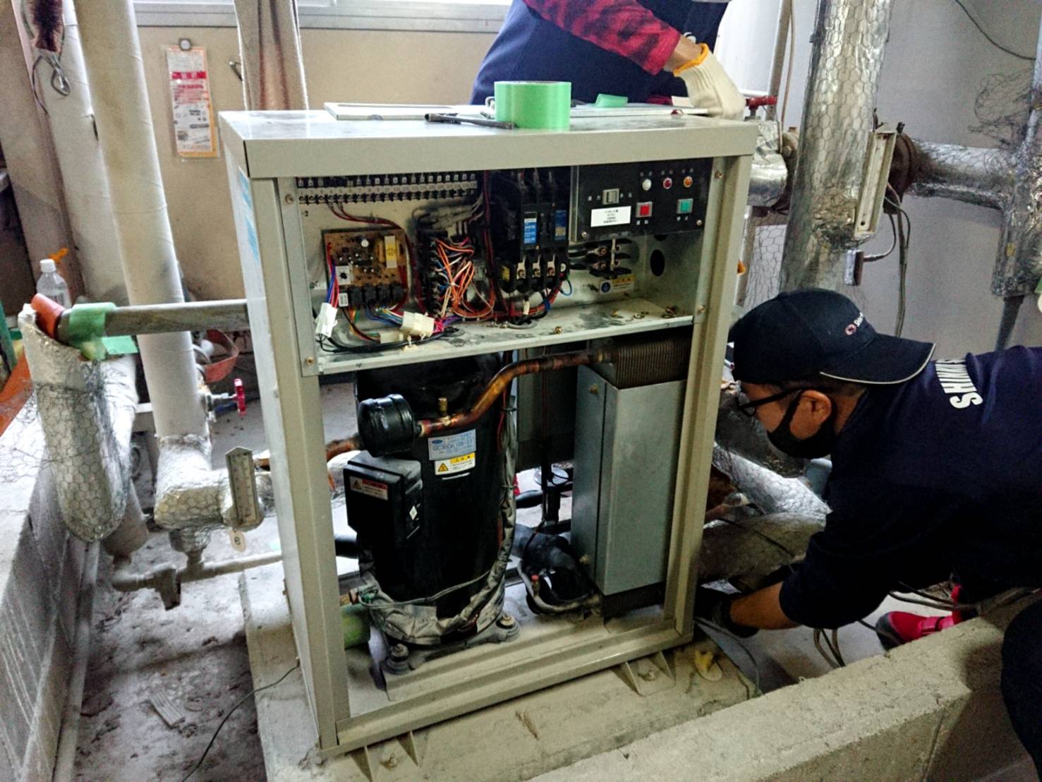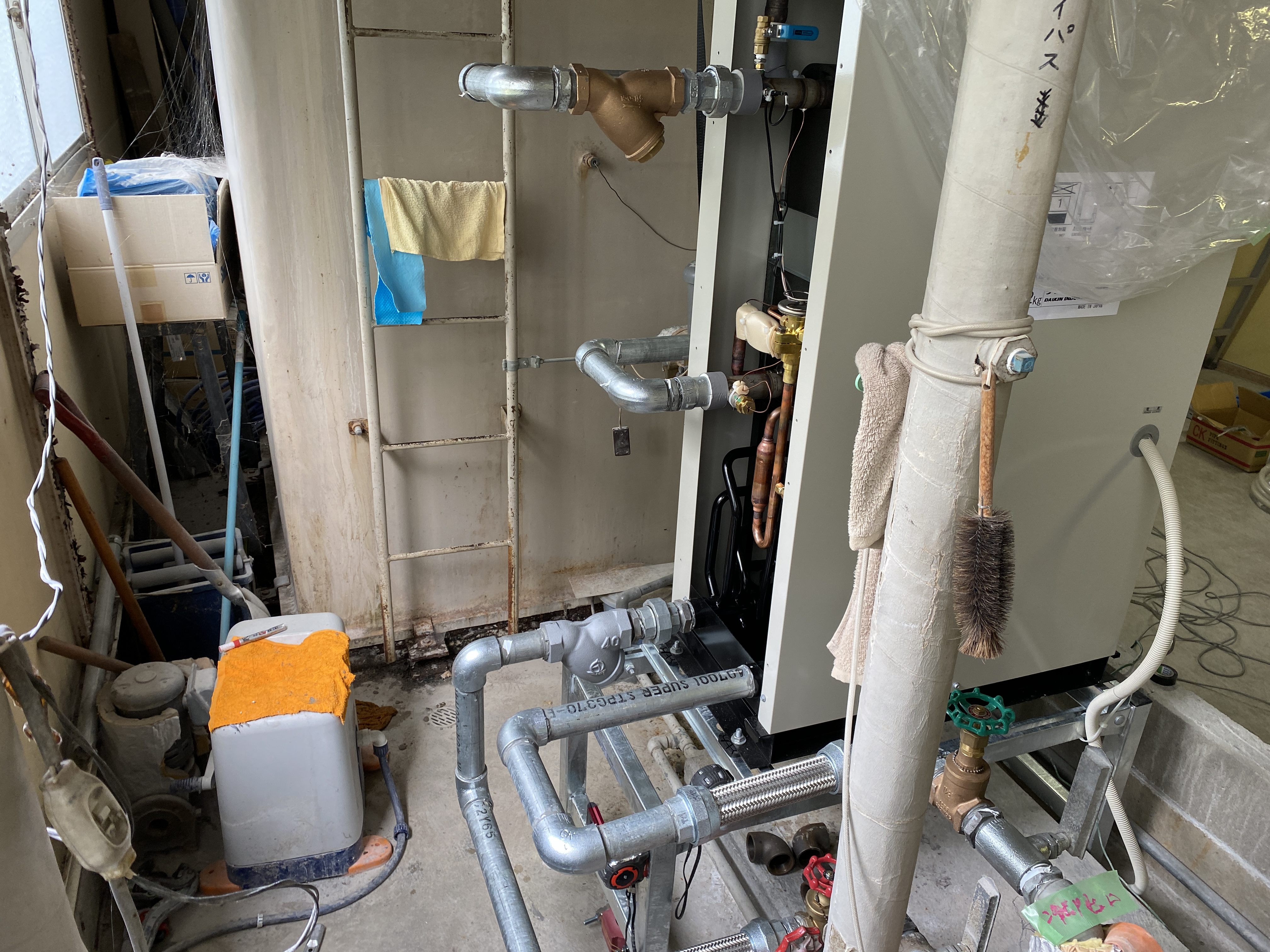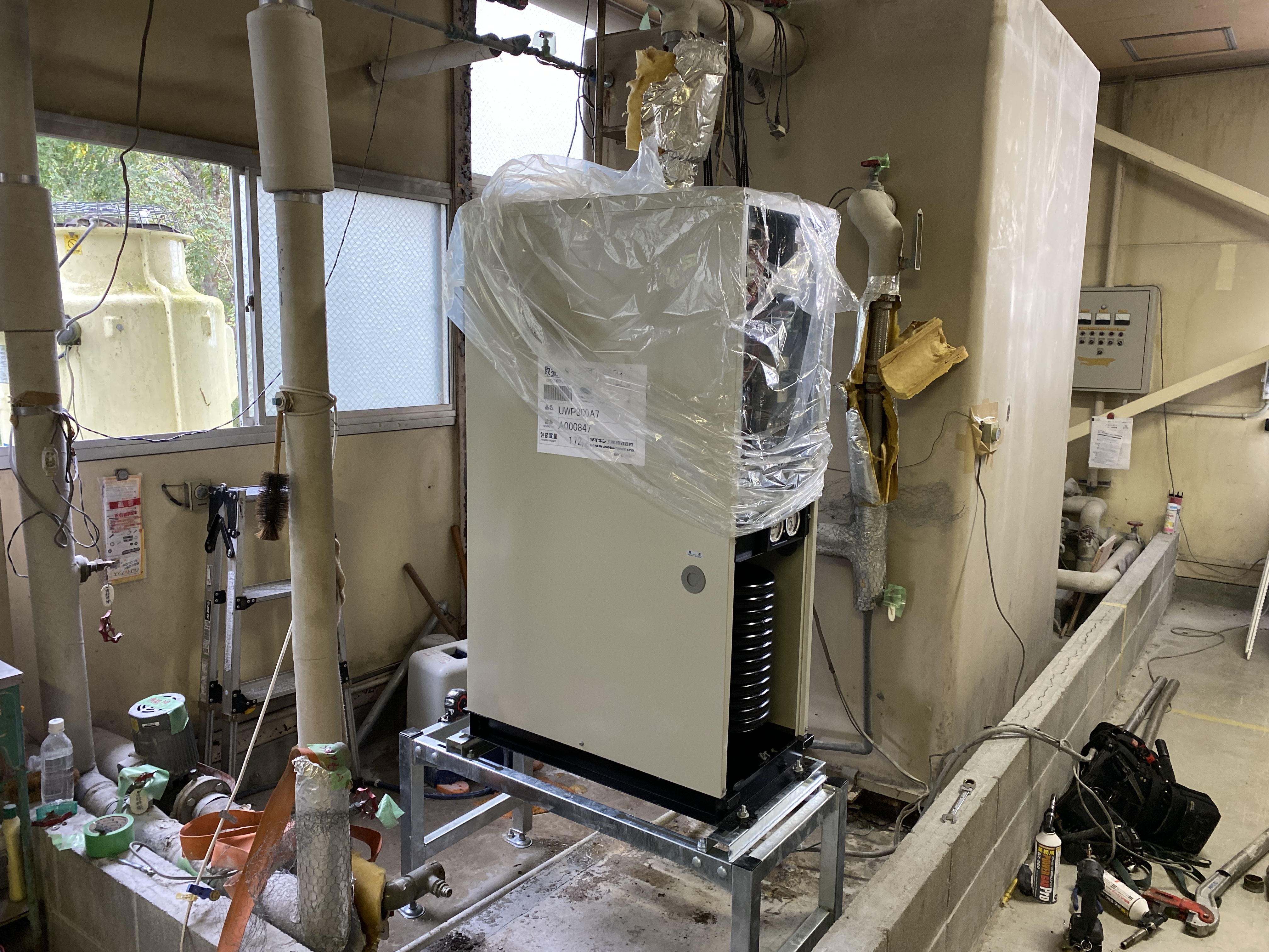 新しい機器は、既存の機器と形が異なったため水配管の取り回し変更が必要となりました。 また、始動停止の制御方法も変更となったため、計装電気配線の工事も行いました。