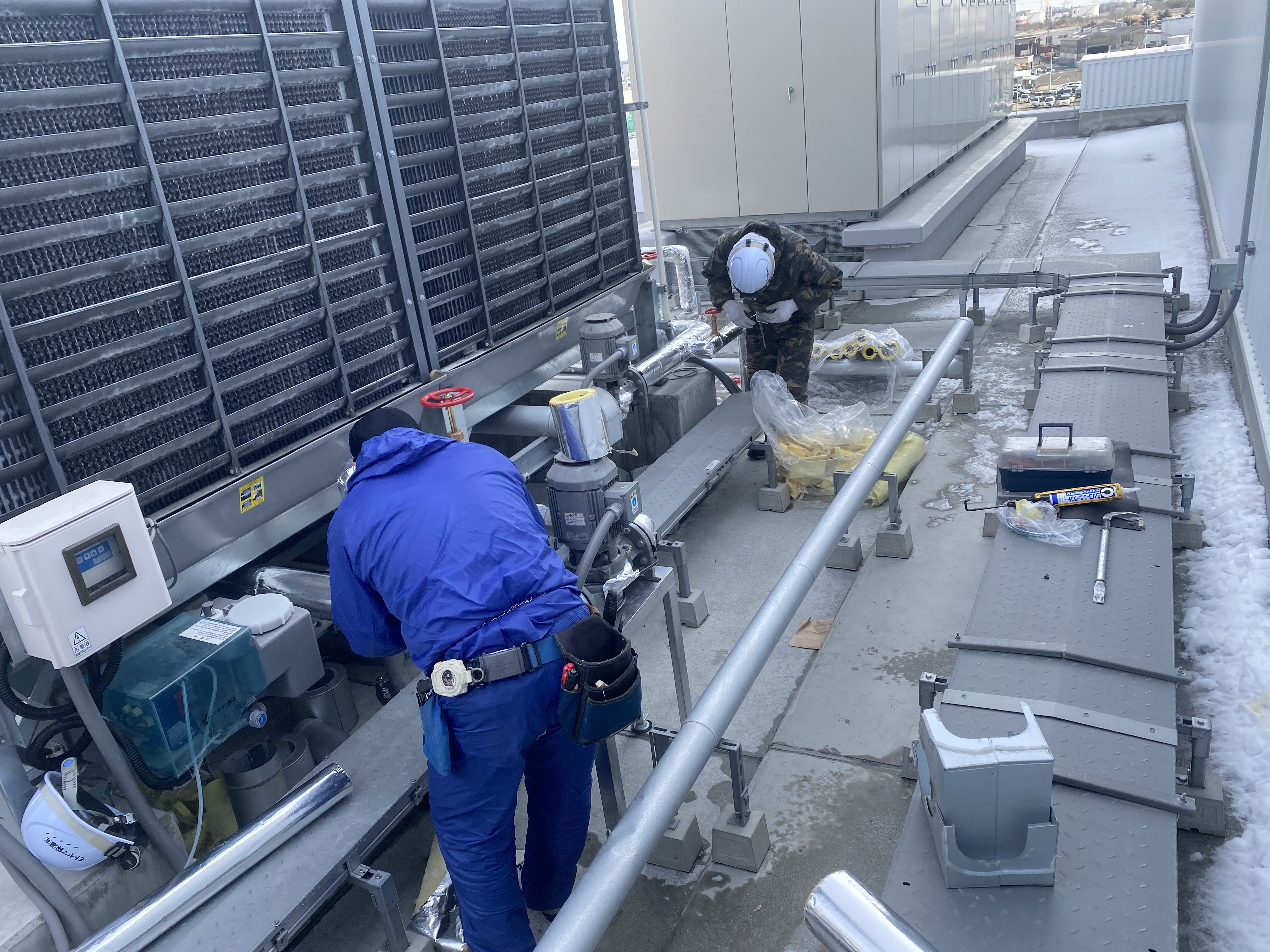 今回の現場が大きな倉庫の屋上にあり、80A対応のねじ切り機の搬入が困難なために、予め自社工場で経路変更分の配管を作成しました。それにより現場では配管の接続と残りの枝管作成のみとしました。 設置場所は、お客様が通る時の動線確保が必要なため限られたスペース内に施工する必要があり、時に狭い作業を強いられる場面もありましたが無事完了することが出来ました。 注意した点は、現地調査の寸法取りです。自社工場にてメイン部分を製作するので、寸法のミスがあってはならないため、厳密な寸法取りを行いました。製作においてもミリ以下で寸法を合わせたり垂直具合も合わせました。 冷却塔水処理装置を設置したことによる効果はお客様の運用の経過観察していく必要があります。熱交換器や配管の詰まりの元になるスケールを抑制した場合は、効率的な運用と設備の延命が見込めます。